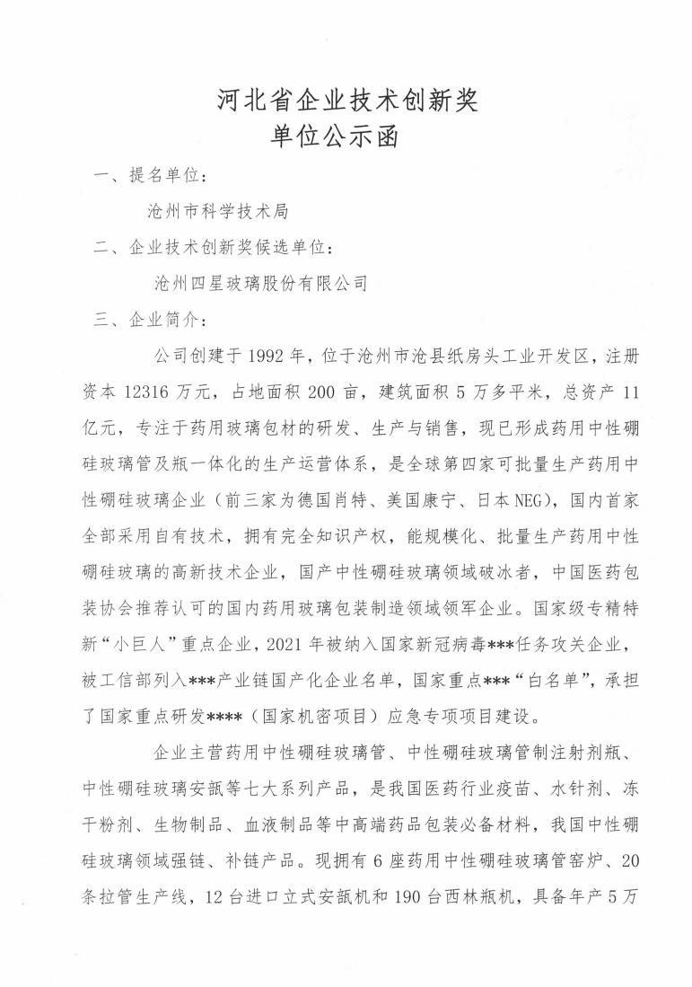 河北省企業(yè)技術(shù)創(chuàng)新獎單位公示函